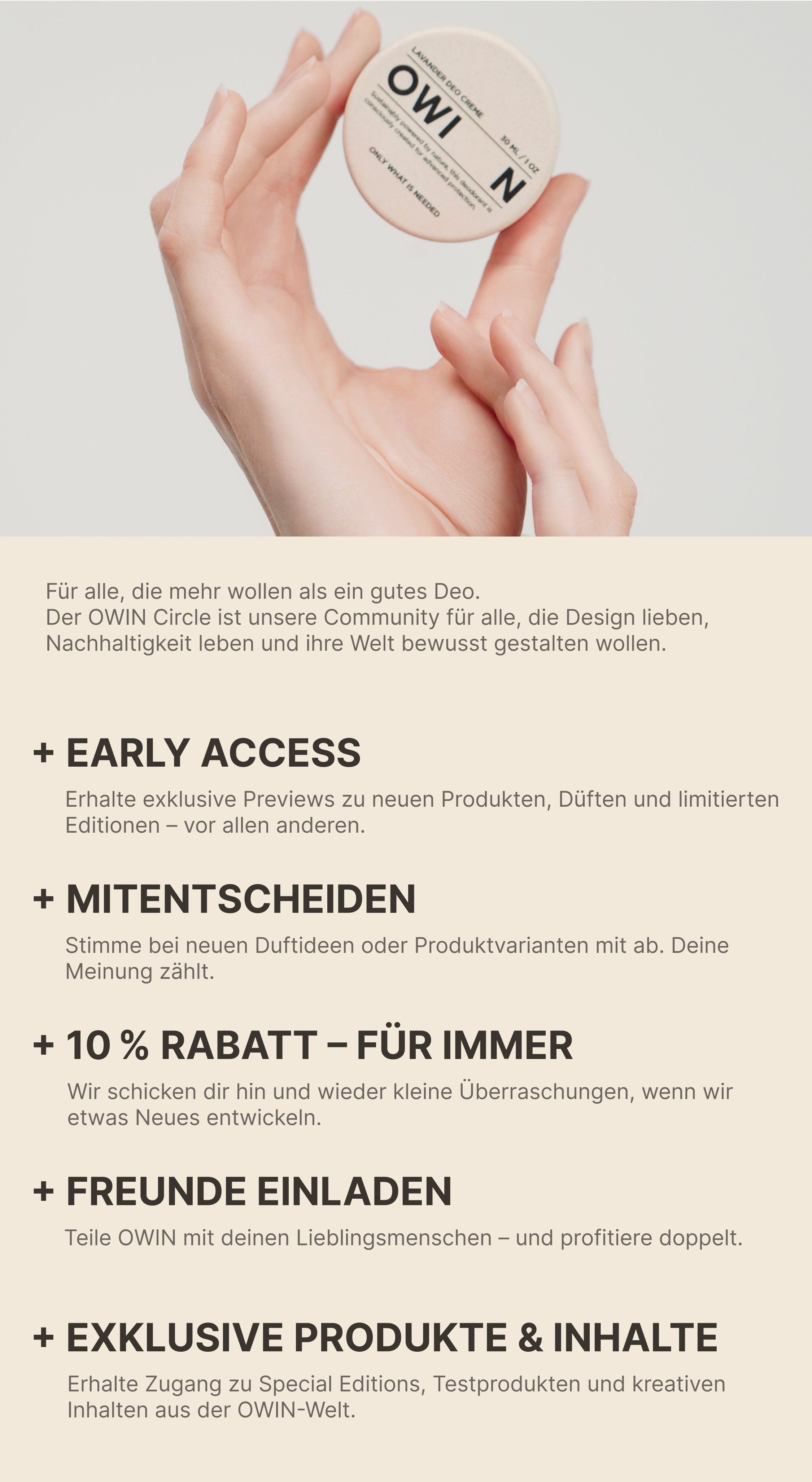 Für alle, die mehr wollen als ein gutes Deo. Der OWIN Circle ist unsere Community für alle, die Design lieben, Nachhaltigkeit leben und ihre Welt bewusst gestalten wollen.